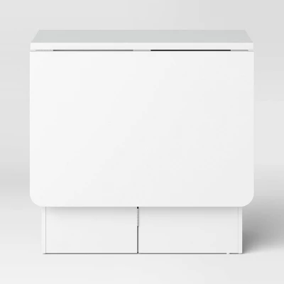 Dine in style with the Drop Leaf Dining Table with Storage Shelves from Room Essentials™. This white dining table is designed in a rectangle shape with two extension leaves to help meet your needs for everyday dinners or special occasions. Plus, it also comes with built-in storage shelves to help you store serveware out of sight but still within reach. Crafted with a wooden frame in a laminated finish, this table makes a beautiful addition to your dining room.