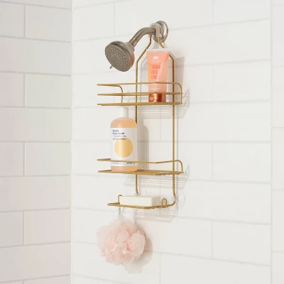 This Metal Over-the-Shower Storage Caddy from Room Essentials™ will help you keep your bath supplies close at hand without cluttering your bathroom. Made from metal, this over-the-shower caddy hangs over the shower head, making it a space-saving alternative for compact bathrooms. It’s designed with two suction cups that help keep it secured to the wall while preventing it from swinging or slipping. This metal shower caddy features a three-tier design to hold everything from shampoo and conditioner to body wash or lotion, while two hooks at each side at the bottom come in handy for hanging loofahs or washcloths. Showcasing a brass finish, it’s sure to add a touch of understated style to your bathroom decor.
